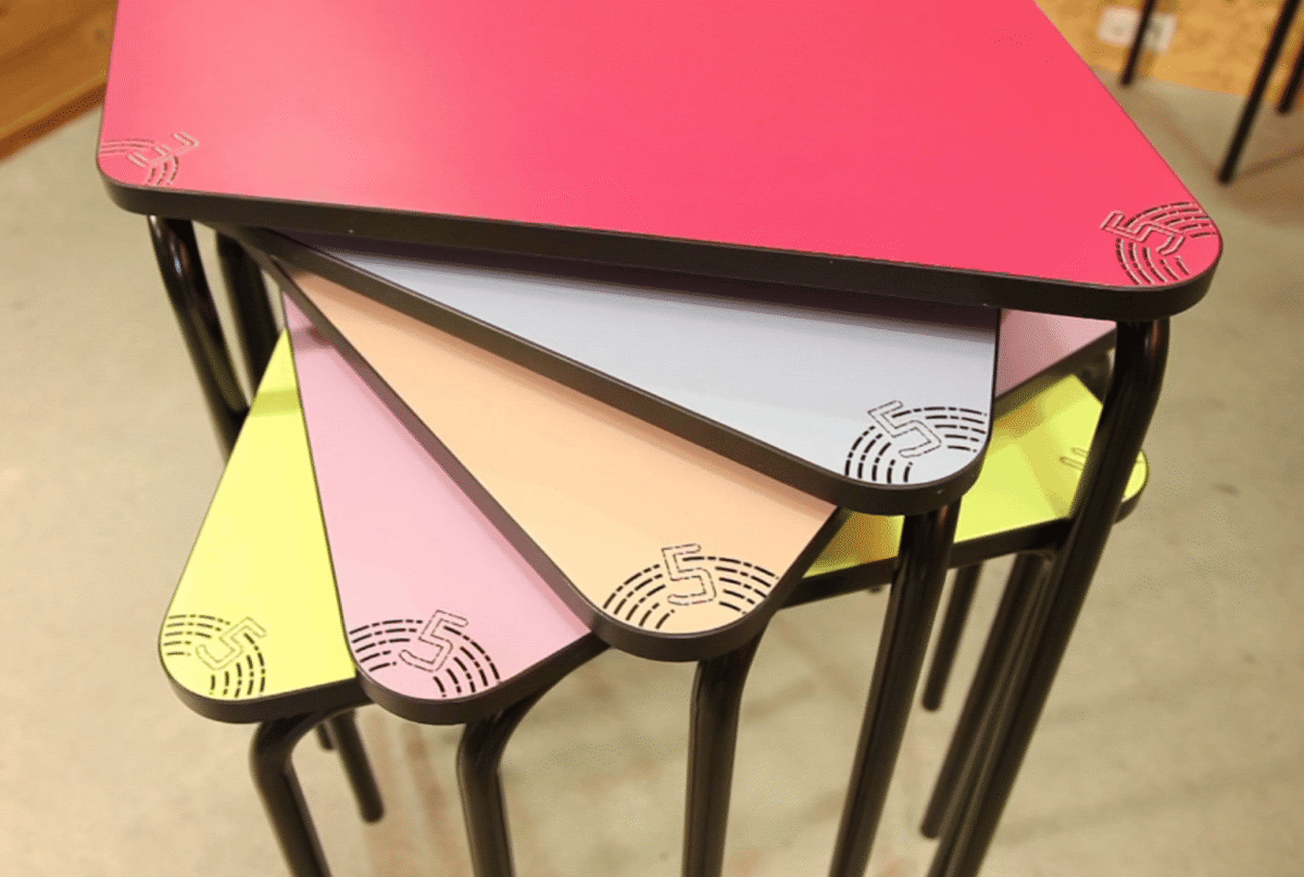 L’innovation de ce mobilier scolaire réside en la forme du plateau. Une forme asymétrique qui permet de créer une multitude de configurations. 3 angles de cette table d’école sont repérés d’un chiffre 3, 4 et 5. Il suffit de regrouper les 3 angles « 3 » de 3 tables pour créer un groupe de 3 écoliers, de regrouper les 4 angles « 4 » de 4 tables pour créer un groupe de 4 écoliers, etc.